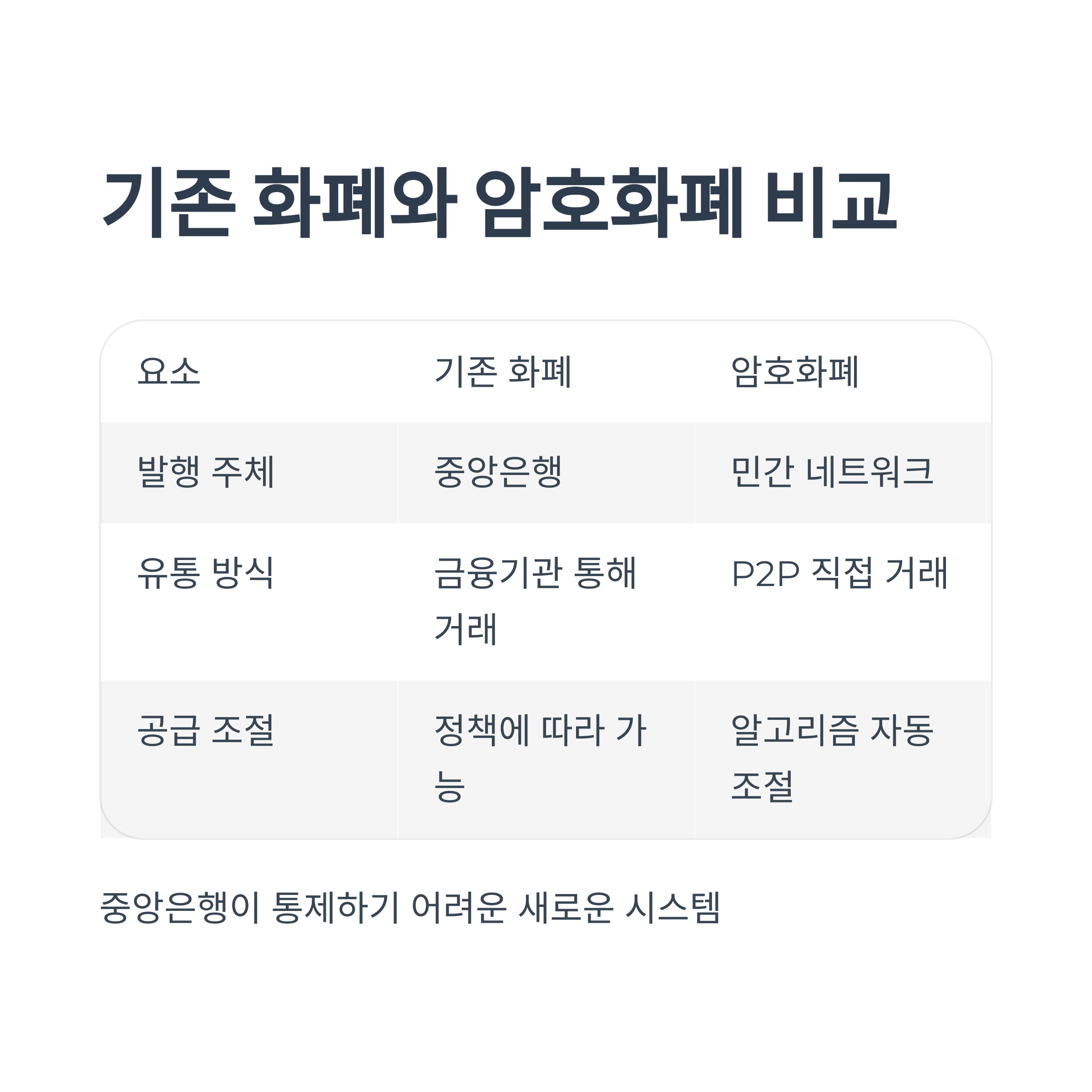 | 발행 주체 | 중앙은행 | 민간 네트워크 또는 기업 |