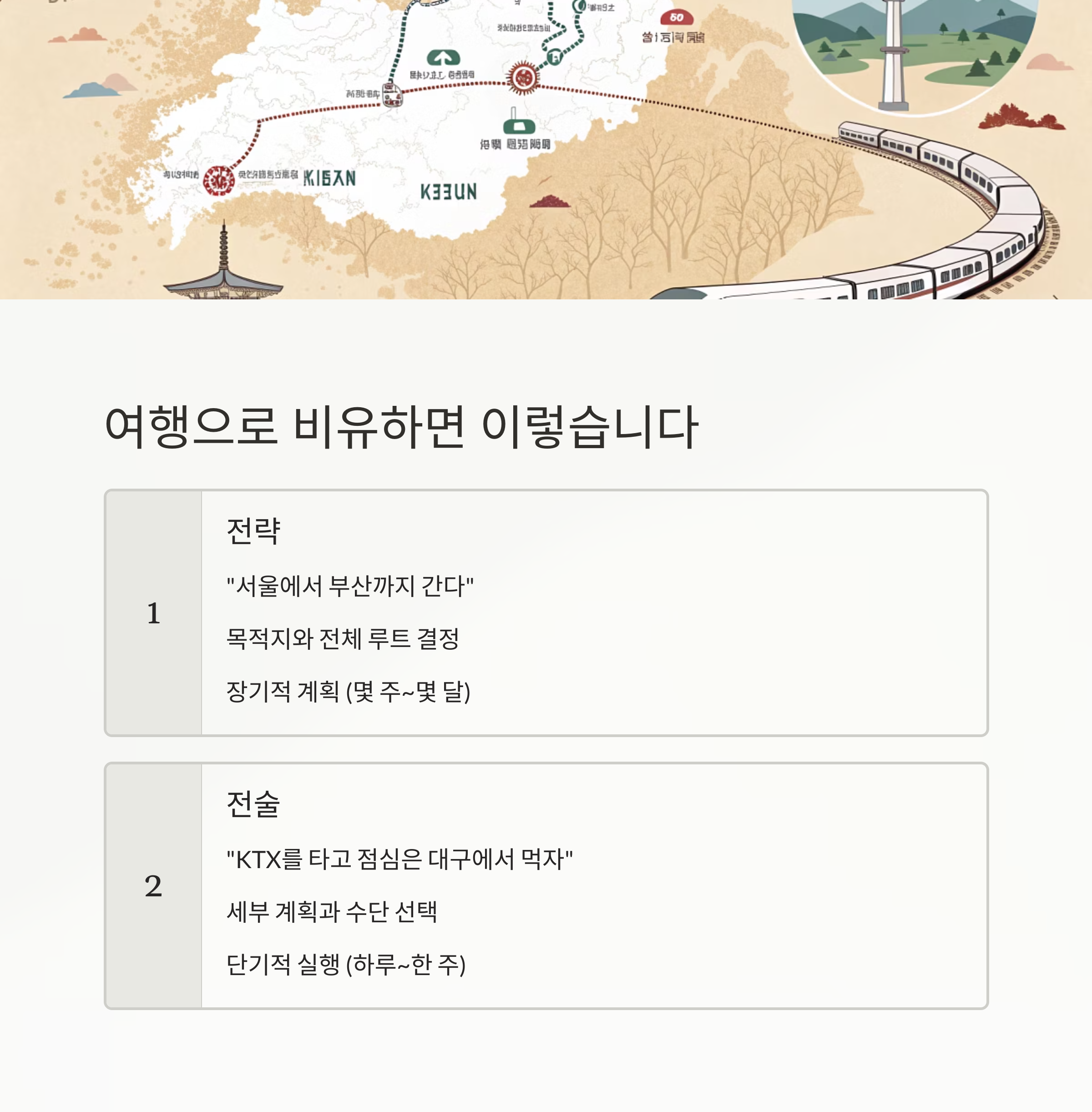 전략과 전술의 관계를 '여행'에 비유해 볼 수 있어요.