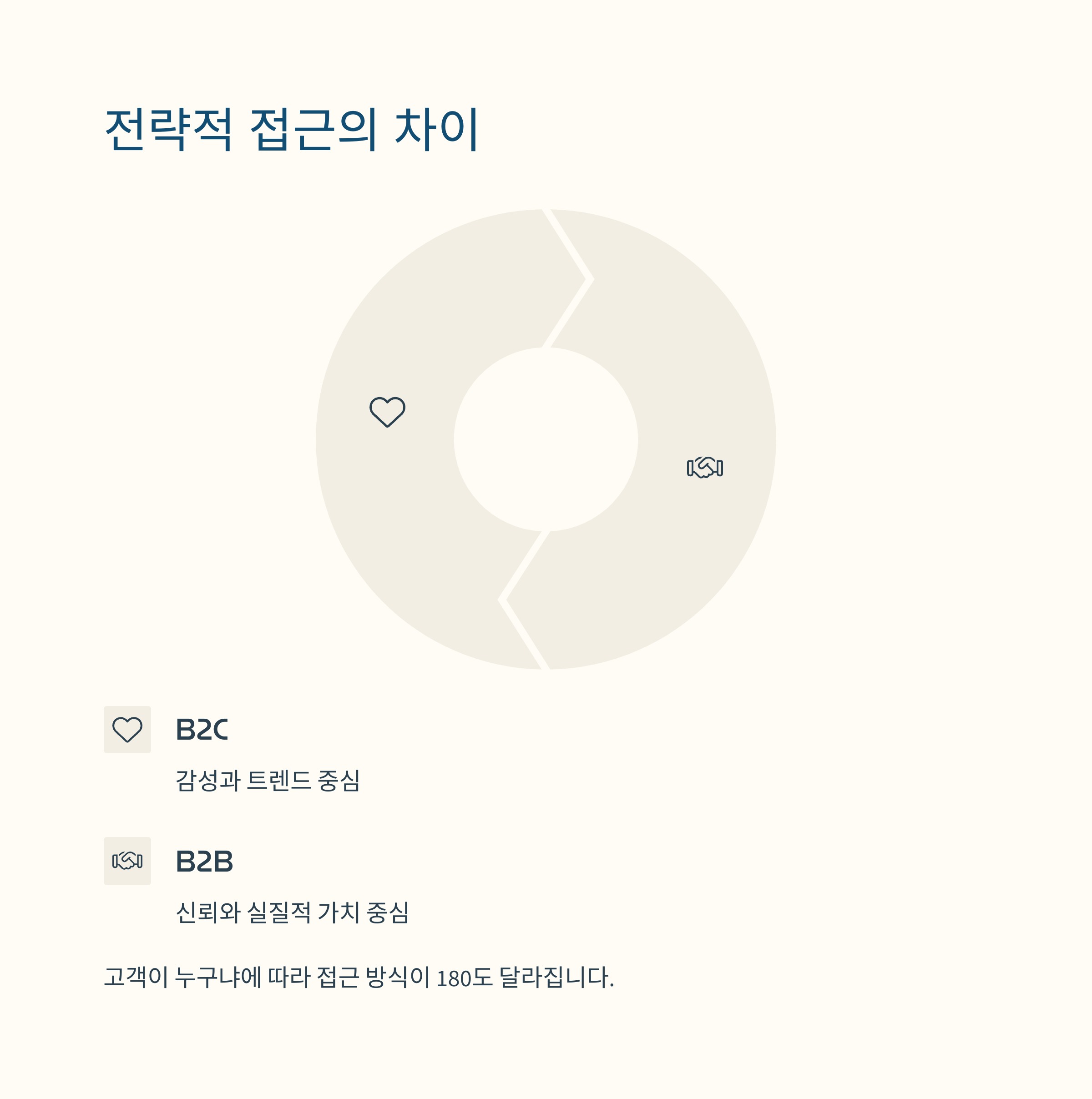 고객이 누구냐에 따라 접근 방식이 180도 달라진다는 점을 기억하세요.