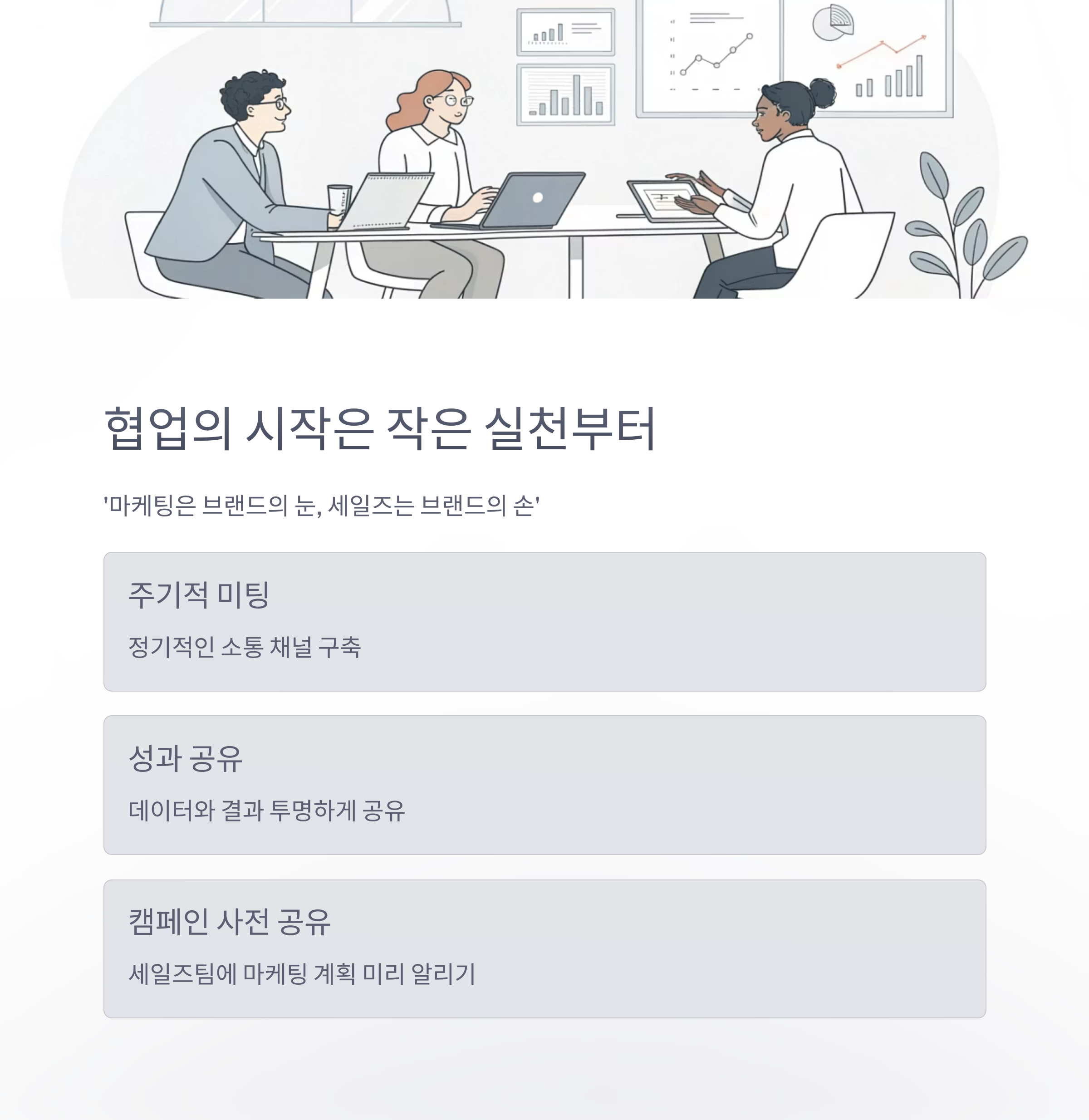주기적인 미팅, 성과 공유, 캠페인 사전 공유 등 작은 실천부터 협업은 시작됩니다.
