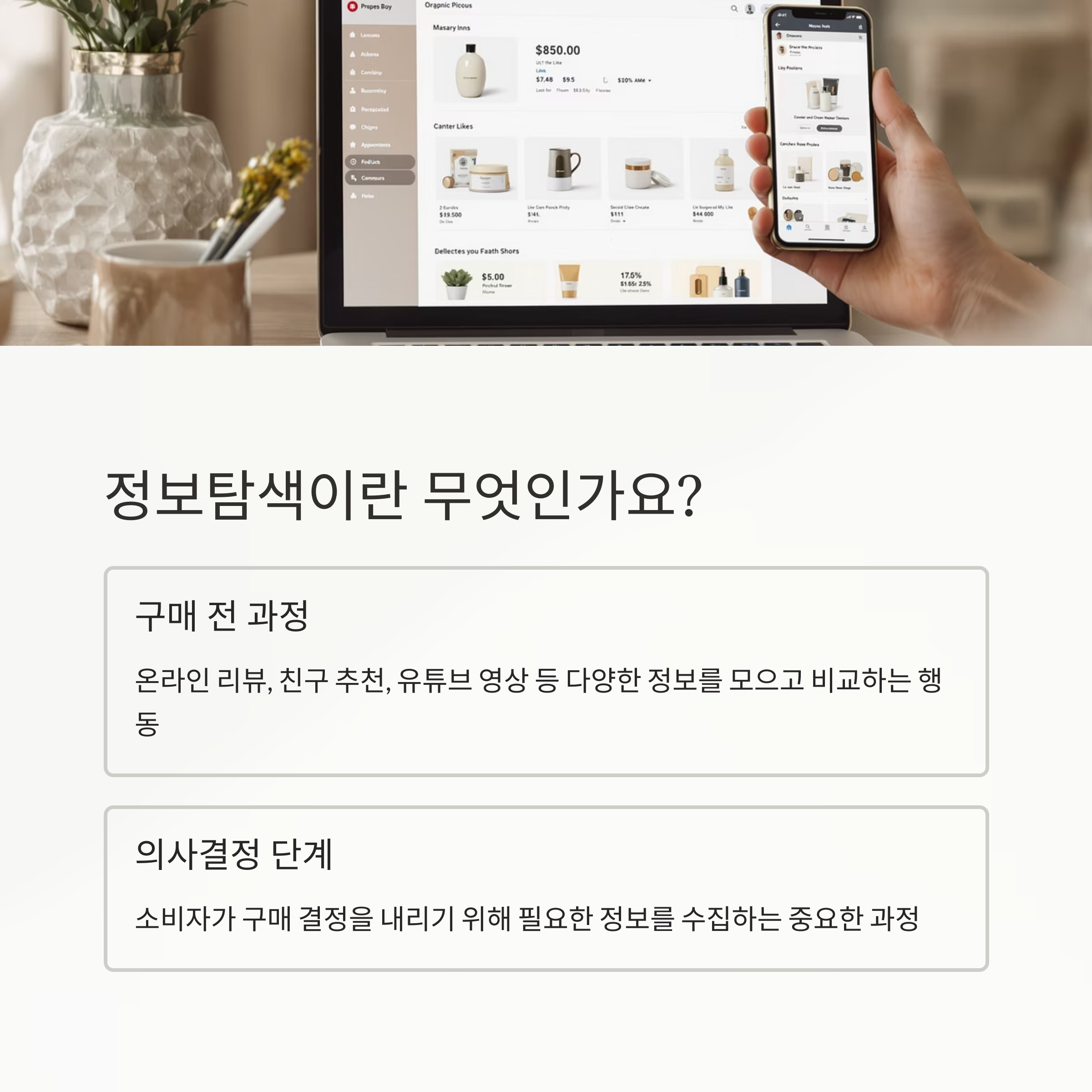 물건을 사기 전 우리는 무의식적으로 수많은 정보를 찾습니다. 온라인 쇼핑몰의 리뷰, 친구의 추천, 유튜브 영상, 블로그 후기 등 다양한 정보를 모으고 비교한 후에야 구매 결정을 내립니다. 이러한 과정이 바로 ‘소비자의 정보탐색 행동’입니다. 이 글에서는 정보탐색이란 무엇인지, 소비자는 어떤 경로로 정보를 수집하는지, 그리고 마케터는 이를 어떻게 활용해야 하는지를 실생활 중심 예시와 함께 설명합니다.