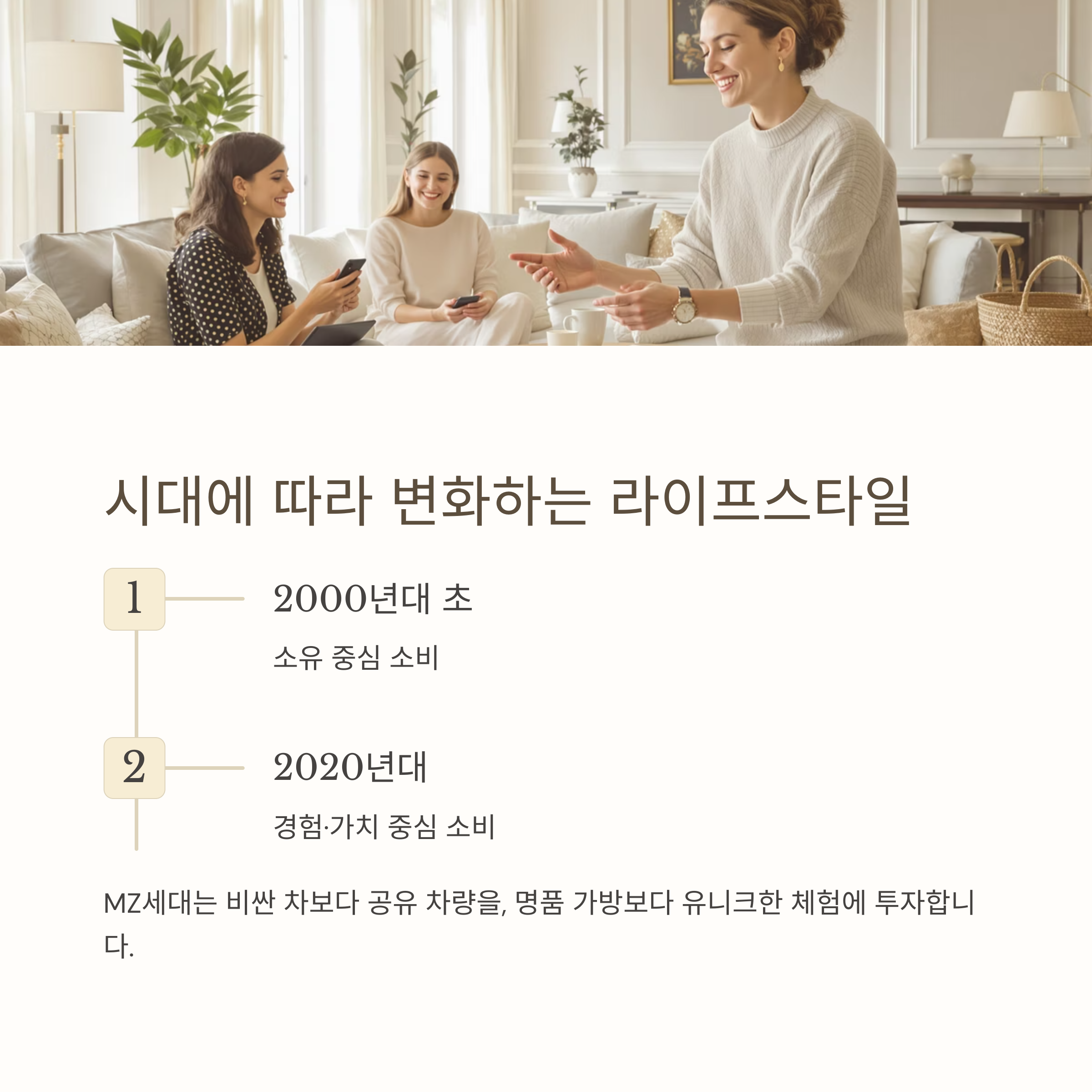 예를 들어, MZ세대는 비싼 차 대신 공유 차량을 사용하고,