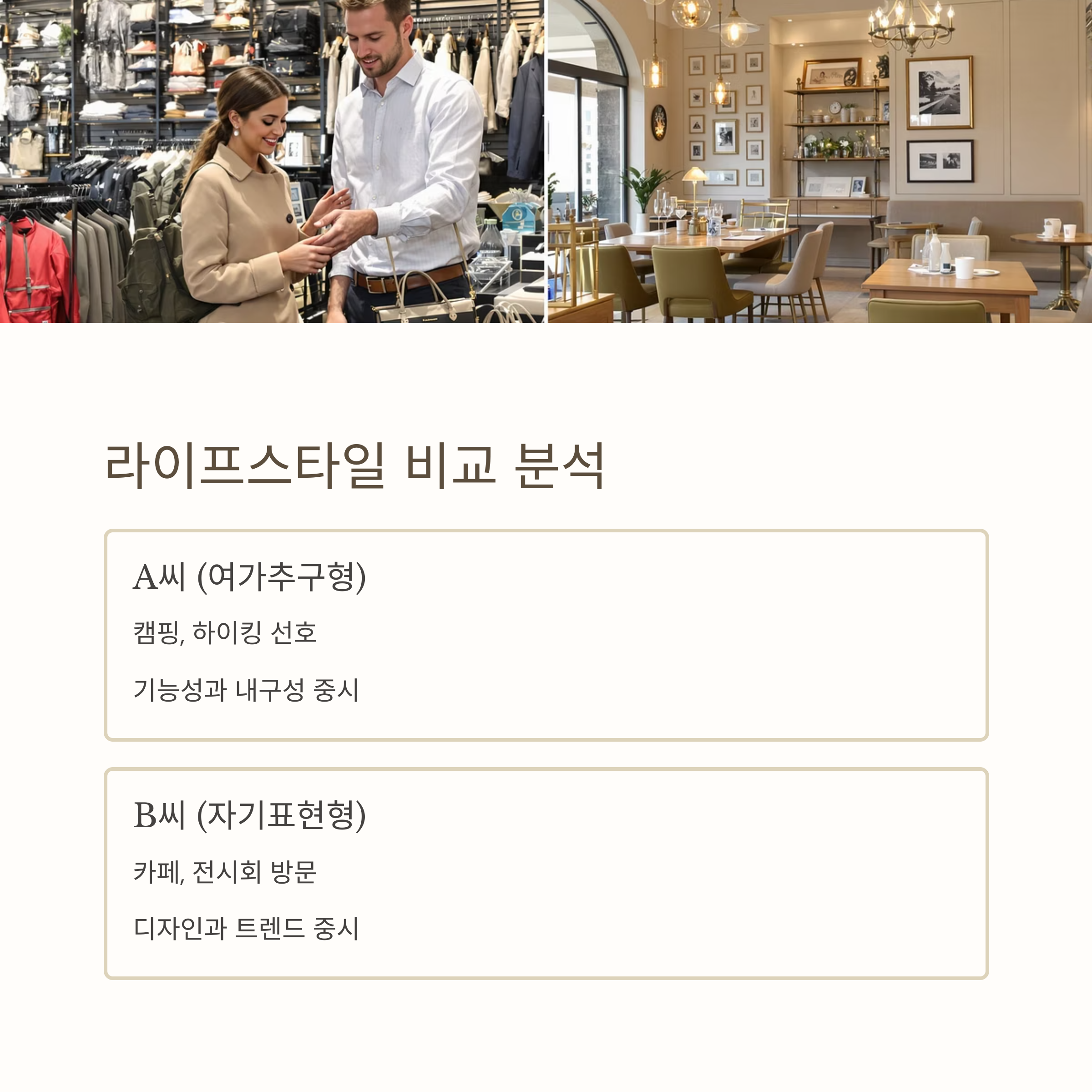 | 선호 상품 | 캠핑 장비, 기능성 등산복 | 감성 굿즈, 인기 카페 굿즈, 디자인 소품 |