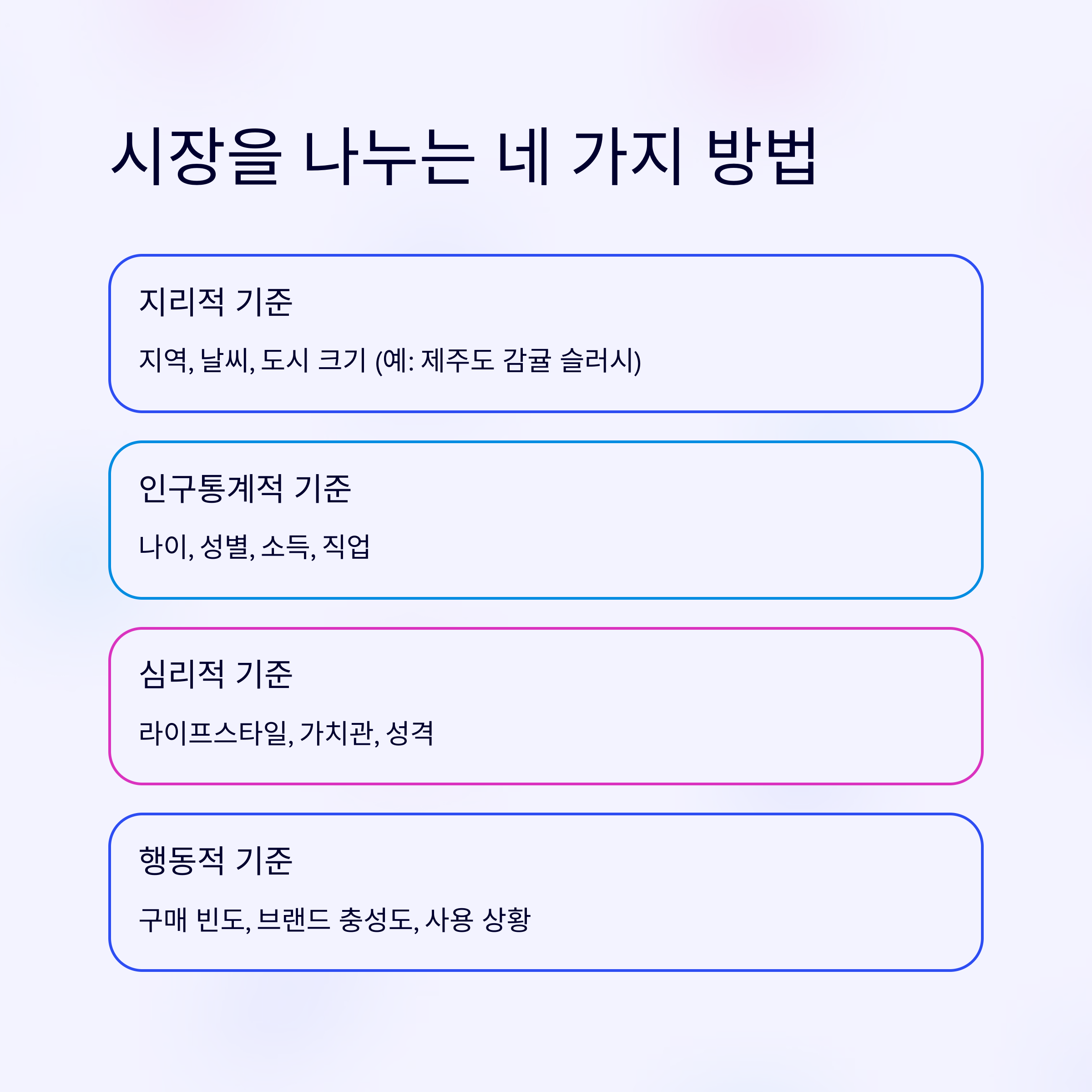 | 행동적 기준 | 구매 빈도, 브랜드 충성도, 사용 상황 등 |