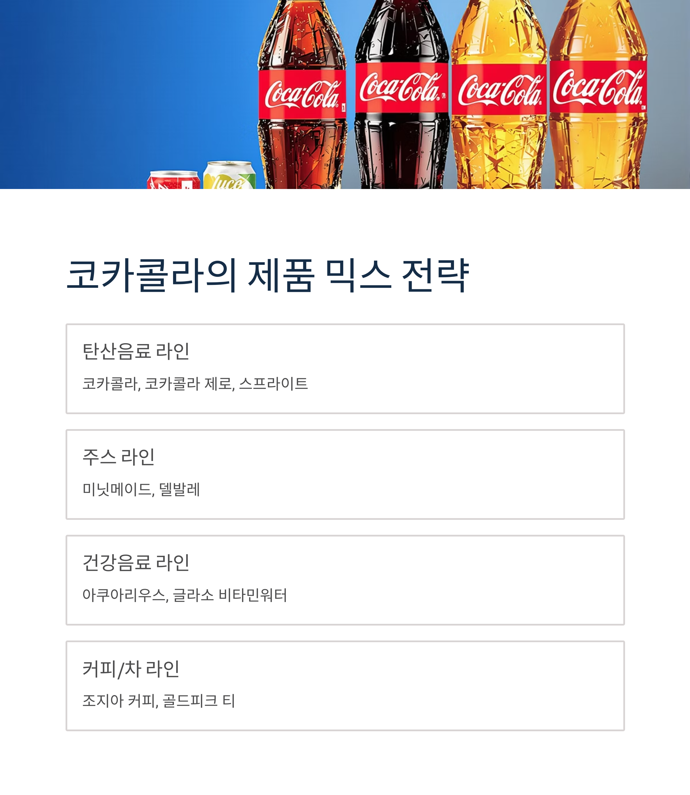 코카콜라의 제품 전략은 제품 라인과 믹스를 아주 잘 보여주는 사례입니다.
