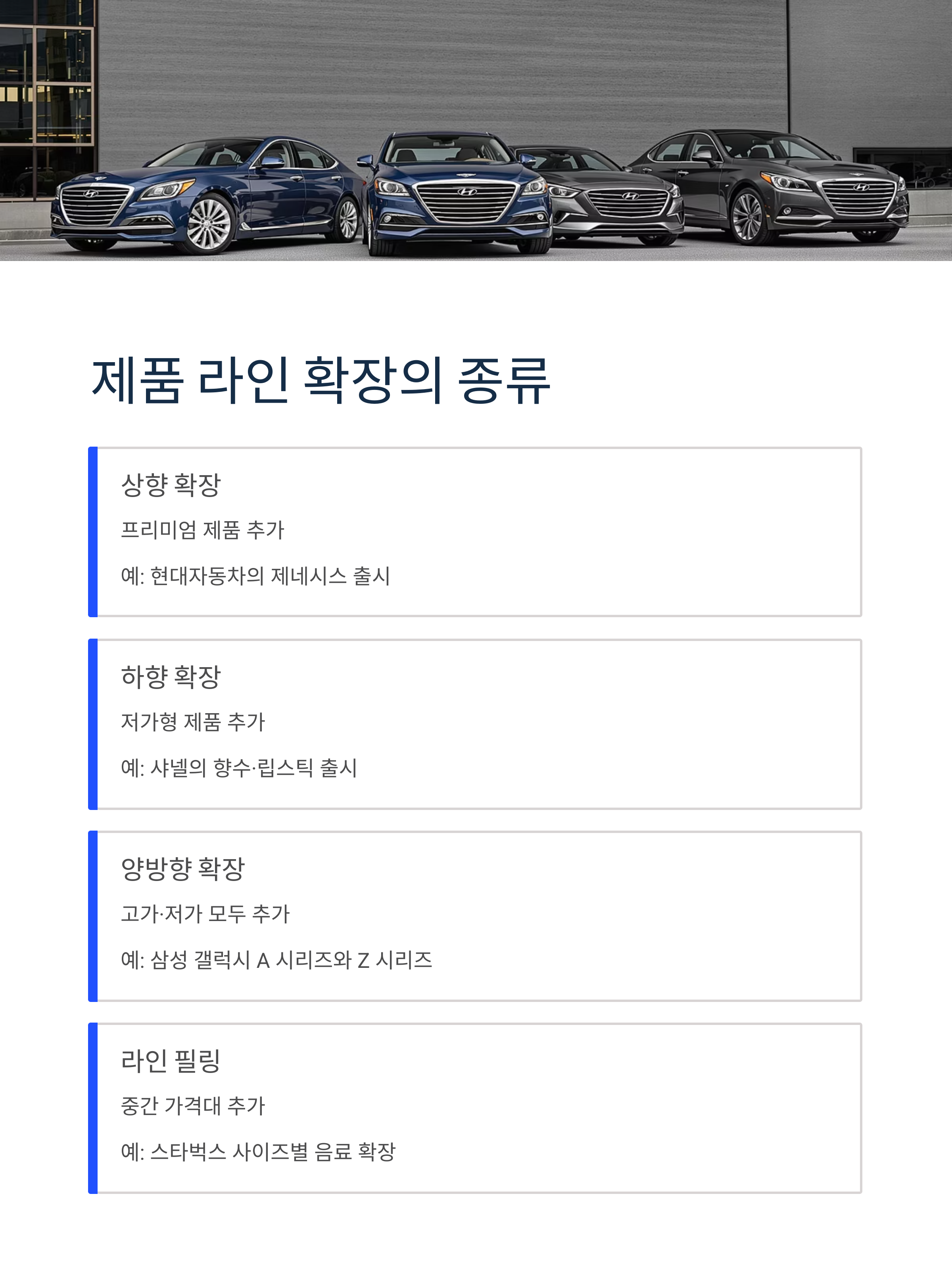 | 상향 확장 | 프리미엄 제품 추가 | 현대자동차의 제네시스 출시 |