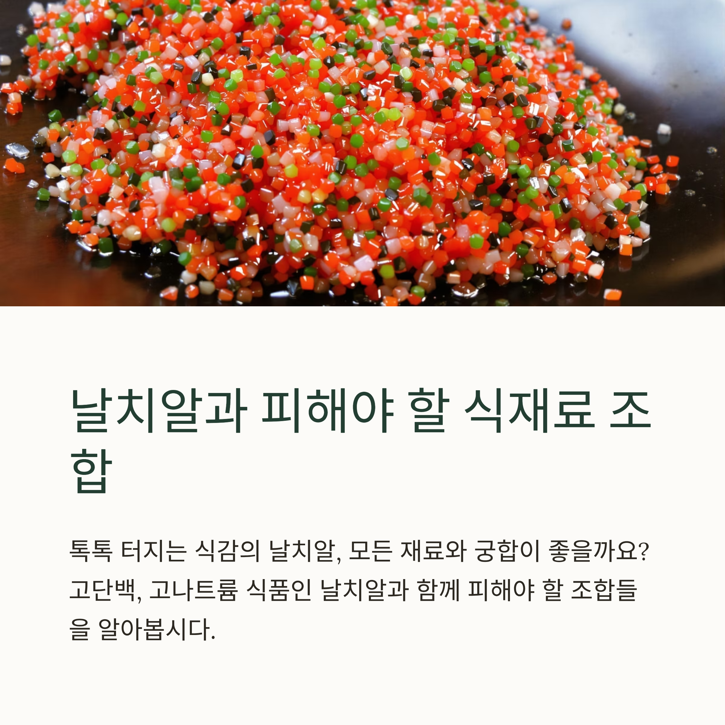 톡톡 터지는 식감과 짭짤한 풍미로 다양한 요리에 활용되는 날치알. 하지만 날치알은 고단백, 고나트륨 식품이기 때문에 모든 재료와의 궁합이 좋은 것은 아닙니다. 영양학적으로 보았을 때, 날치알과 함께 섭취할 경우 소화에 부담을 주거나 영양 균형을 깨뜨리는 조합도 존재합니다. 오늘은 날치알과 함께 먹을 때 주의해야 할 식재료를 구체적인 예와 함께 정리해 보겠습니다.