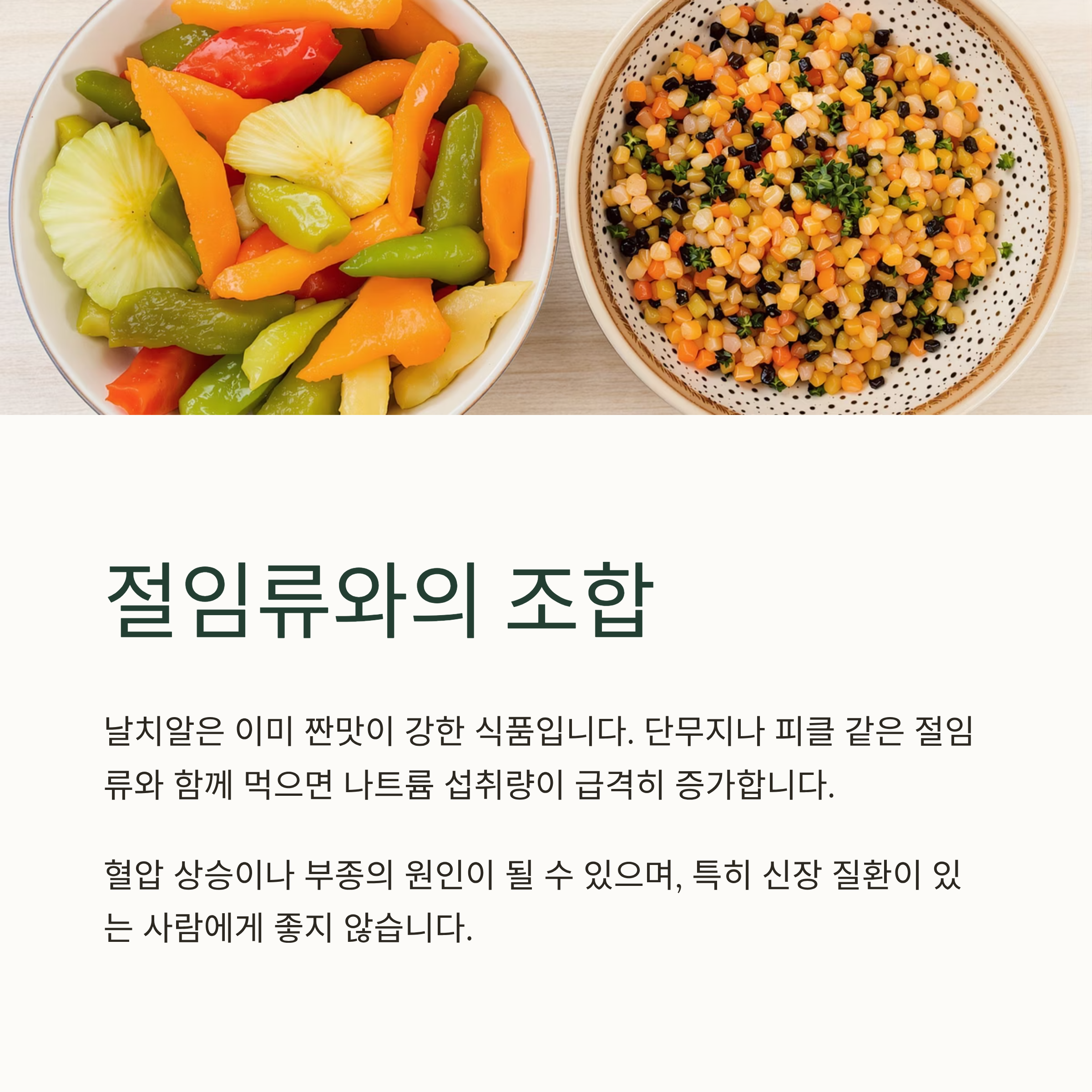 | 절임류(단무지, 피클) | 나트륨 과다 | 생야채, 무염 샐러드 |