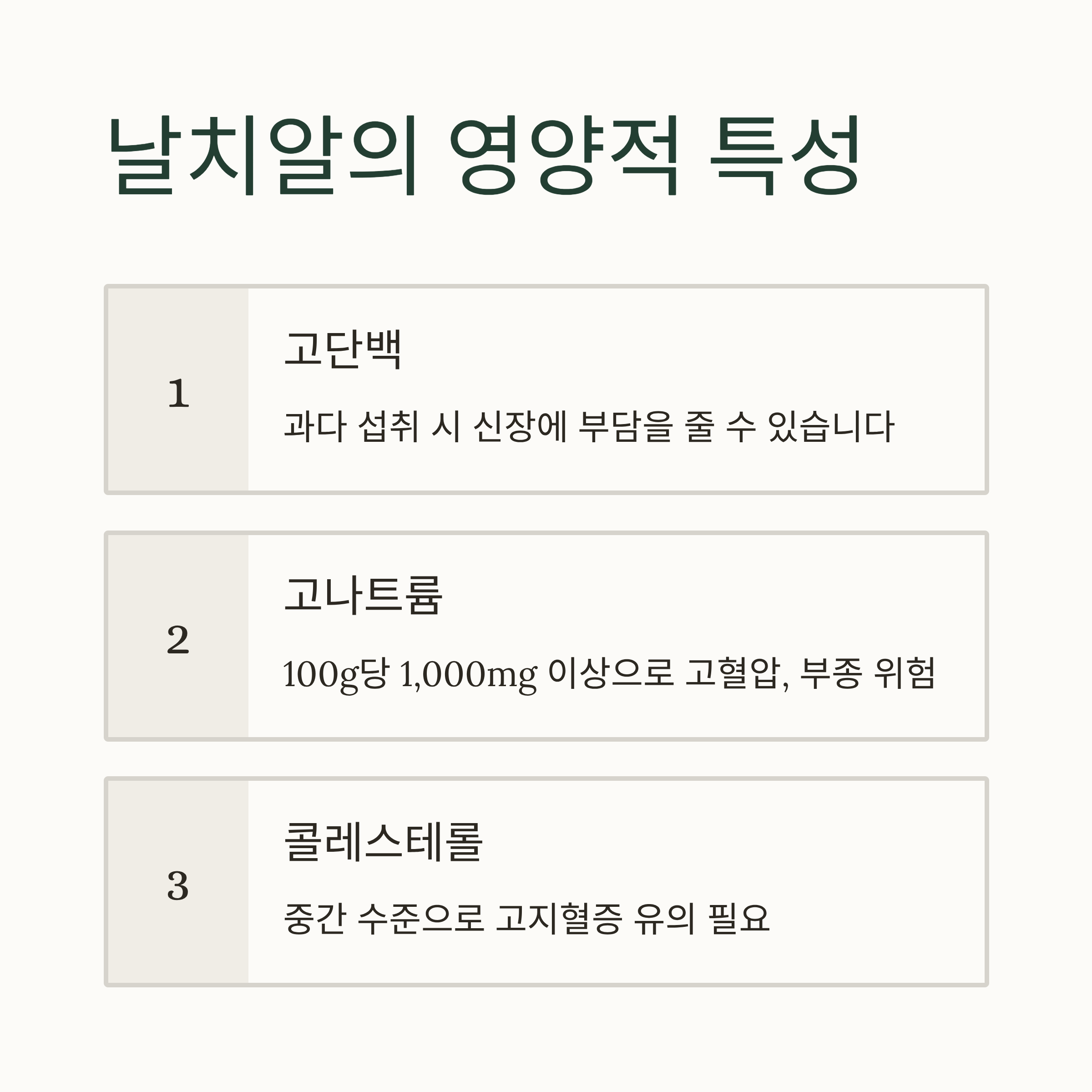 | 나트륨 | 함량 높음 (100g당 1,000mg 이상) | 고혈압, 부종 위험 |