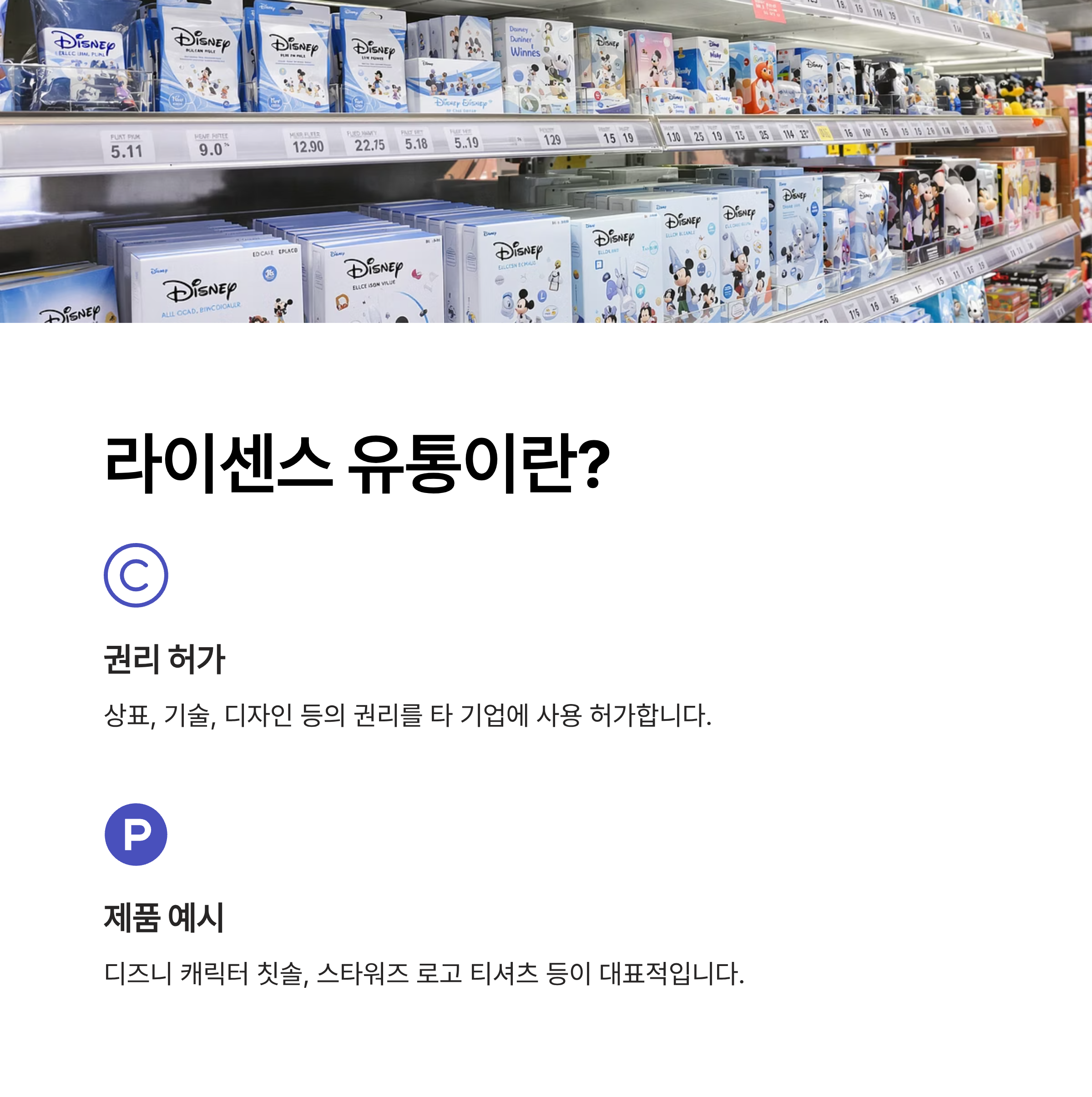 사용할 수 있도록 허가하는 방식입니다. 예를 들어, **'디즈니 캐릭터가 그려진 어린이 칫솔'**이나