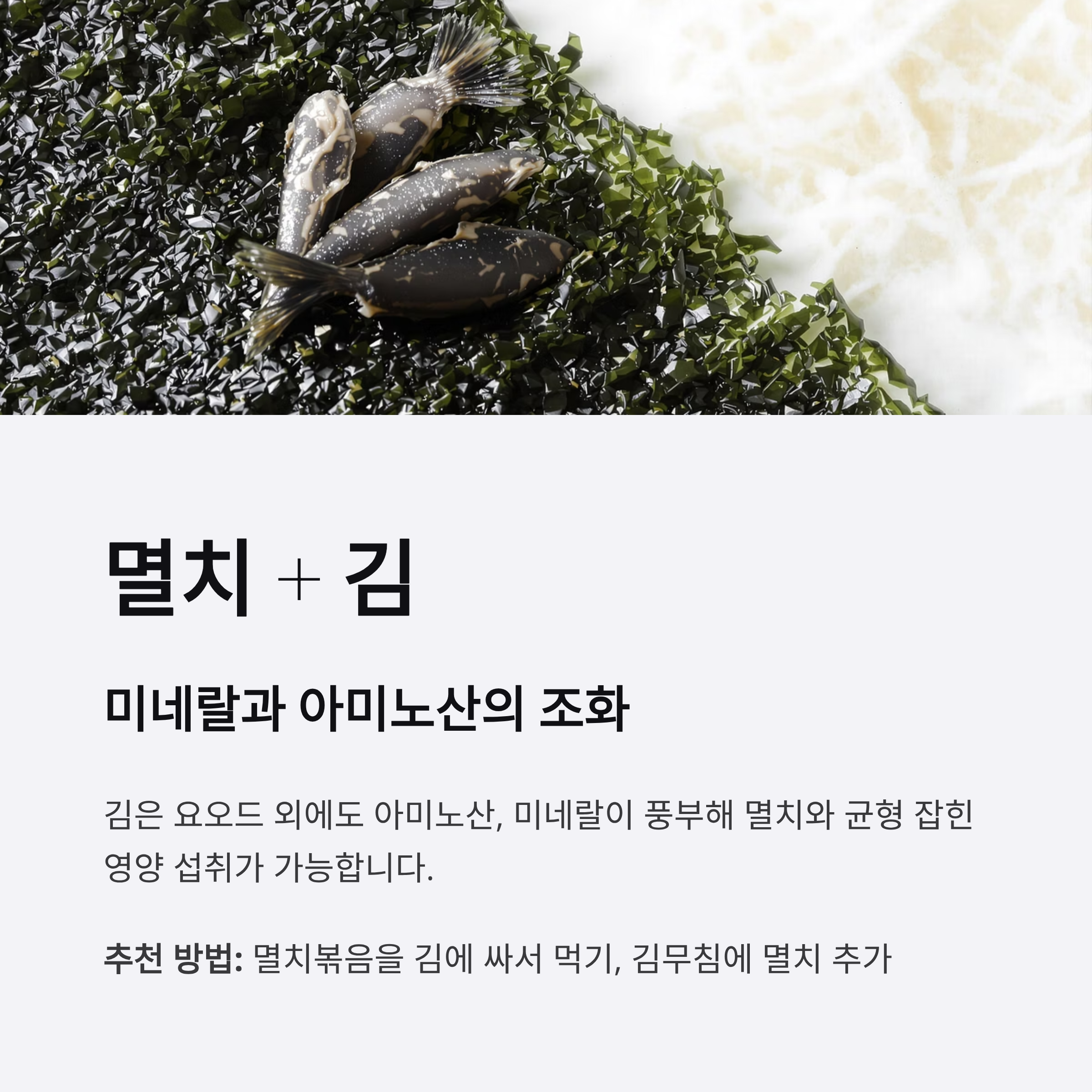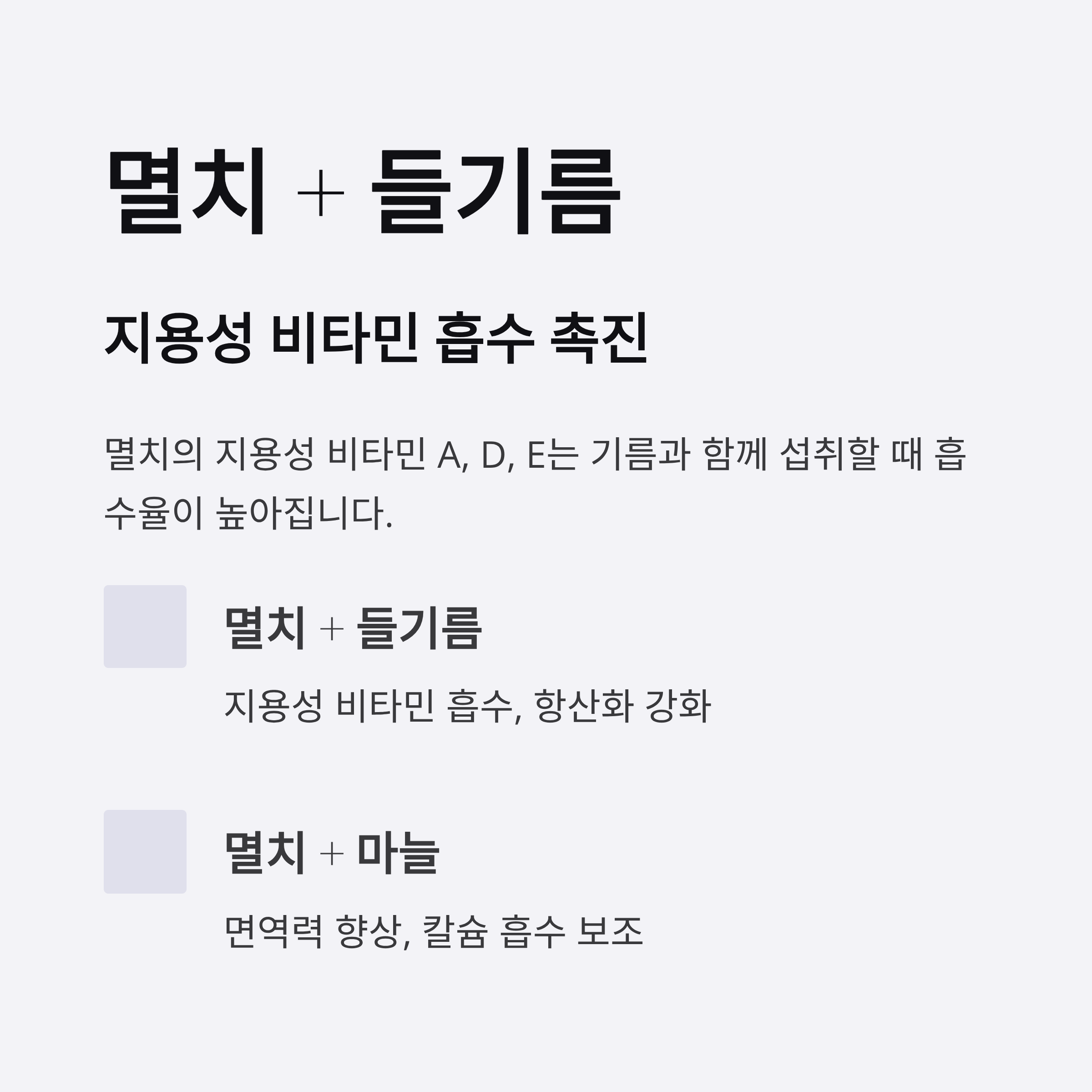 | 멸치 + 들기름 | 지용성 비타민 흡수, 항산화 강화 |