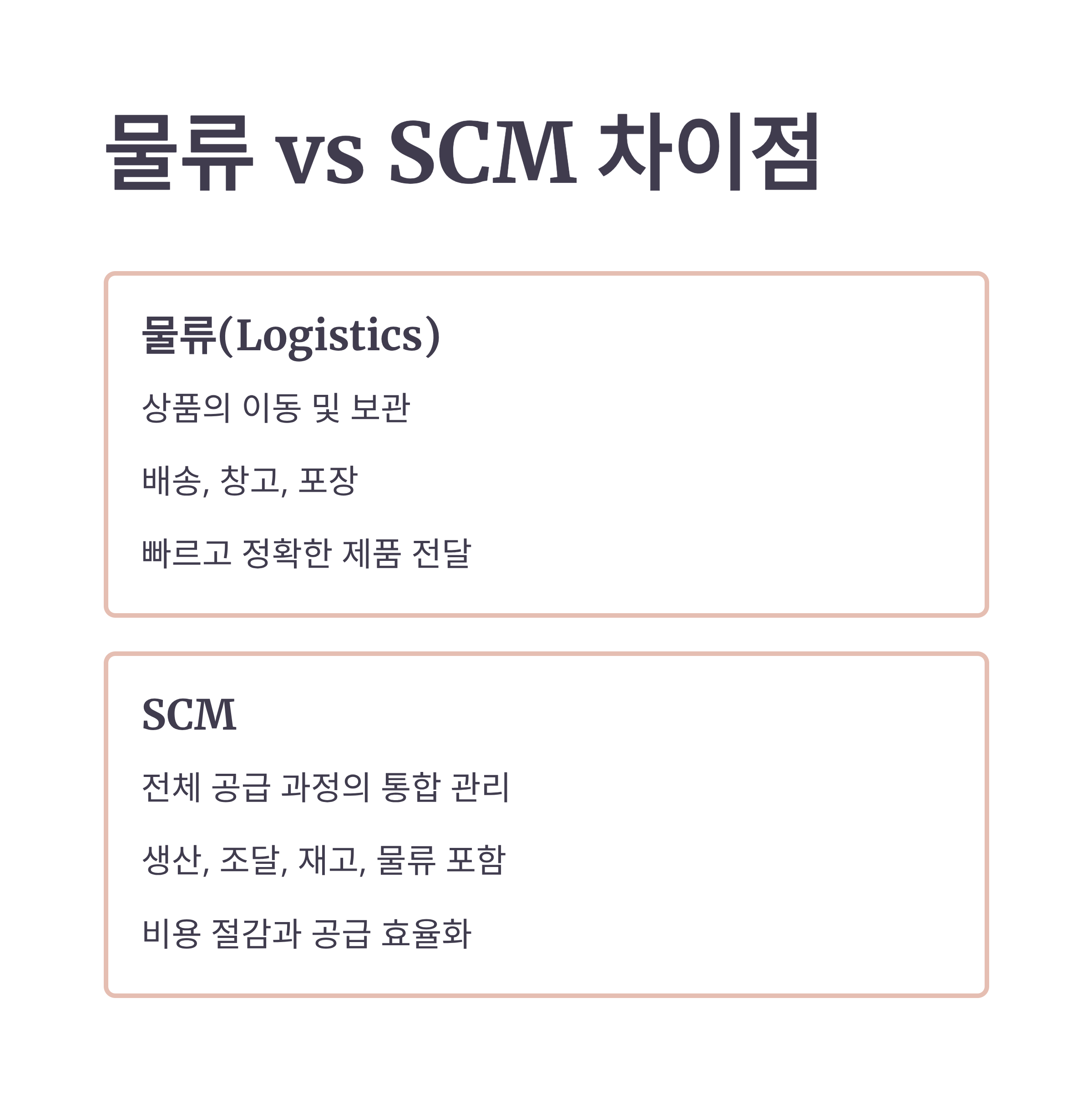 | 개념 | 상품의 이동 및 보관 | 전체 공급 과정의 통합 관리 |