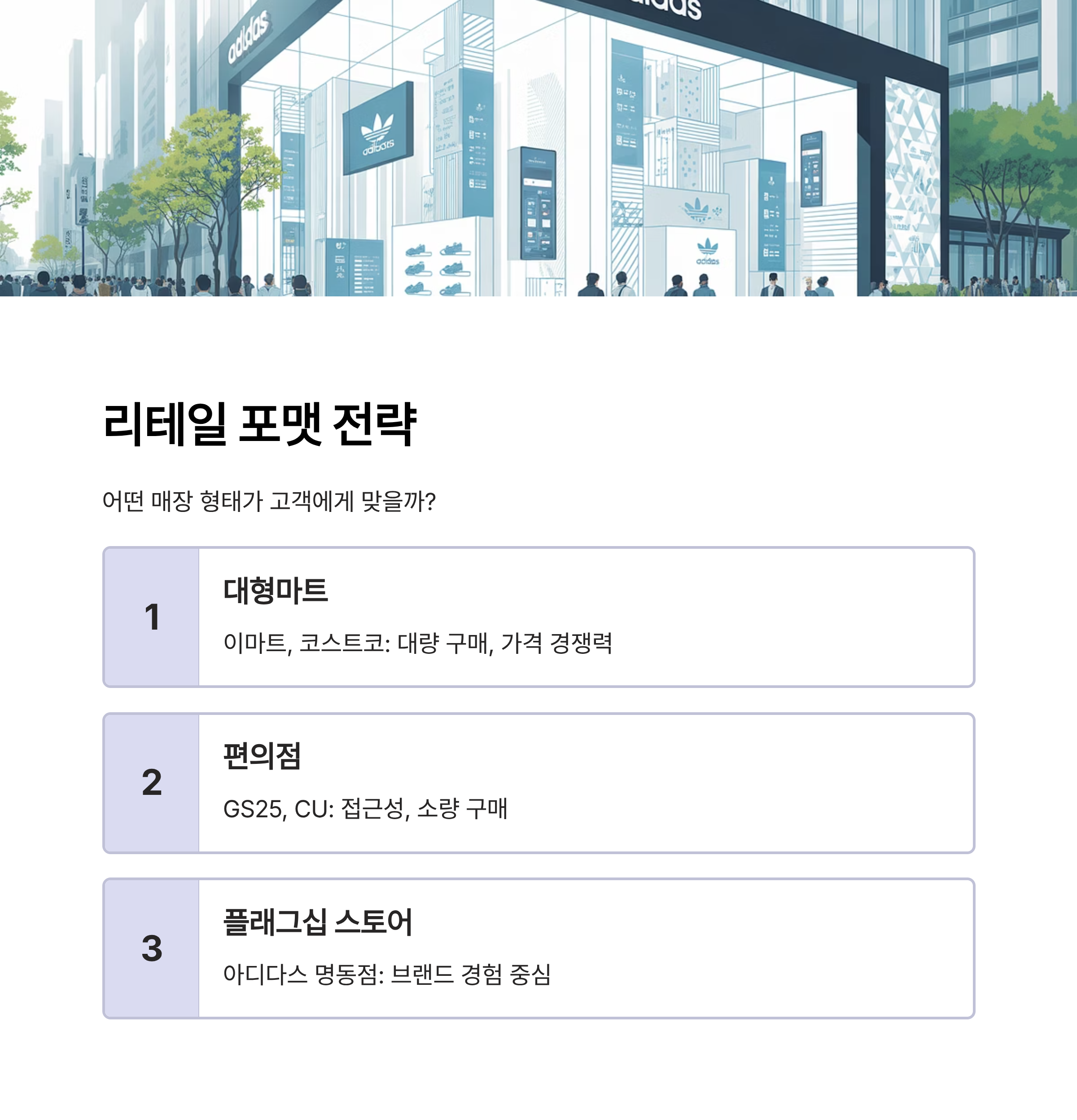 | 플래그십 스토어 | 브랜드 경험 중심 | 아디다스 명동점 |