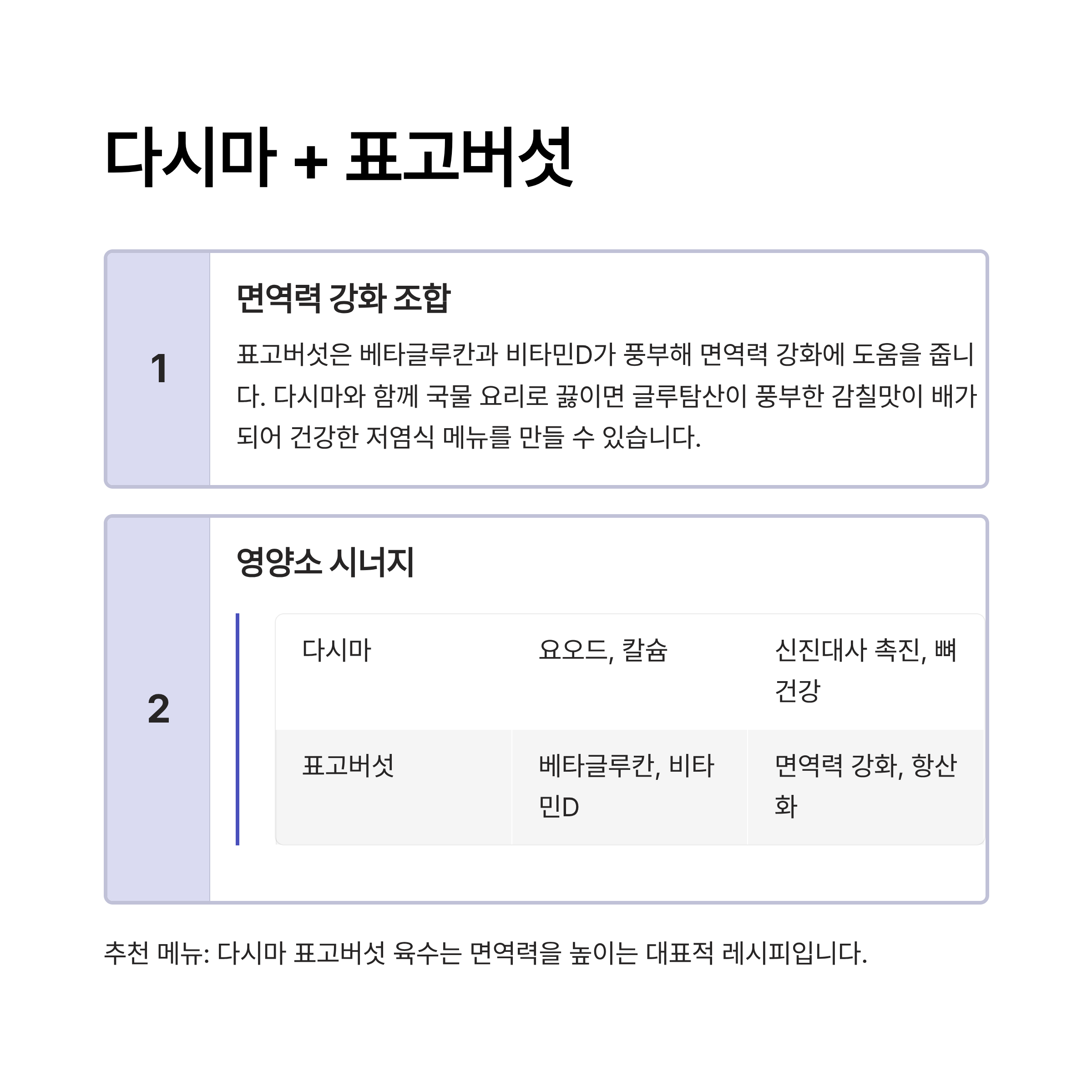 | 표고버섯 | 베타글루칸, 비타민D | 면역력 강화, 항산화 |