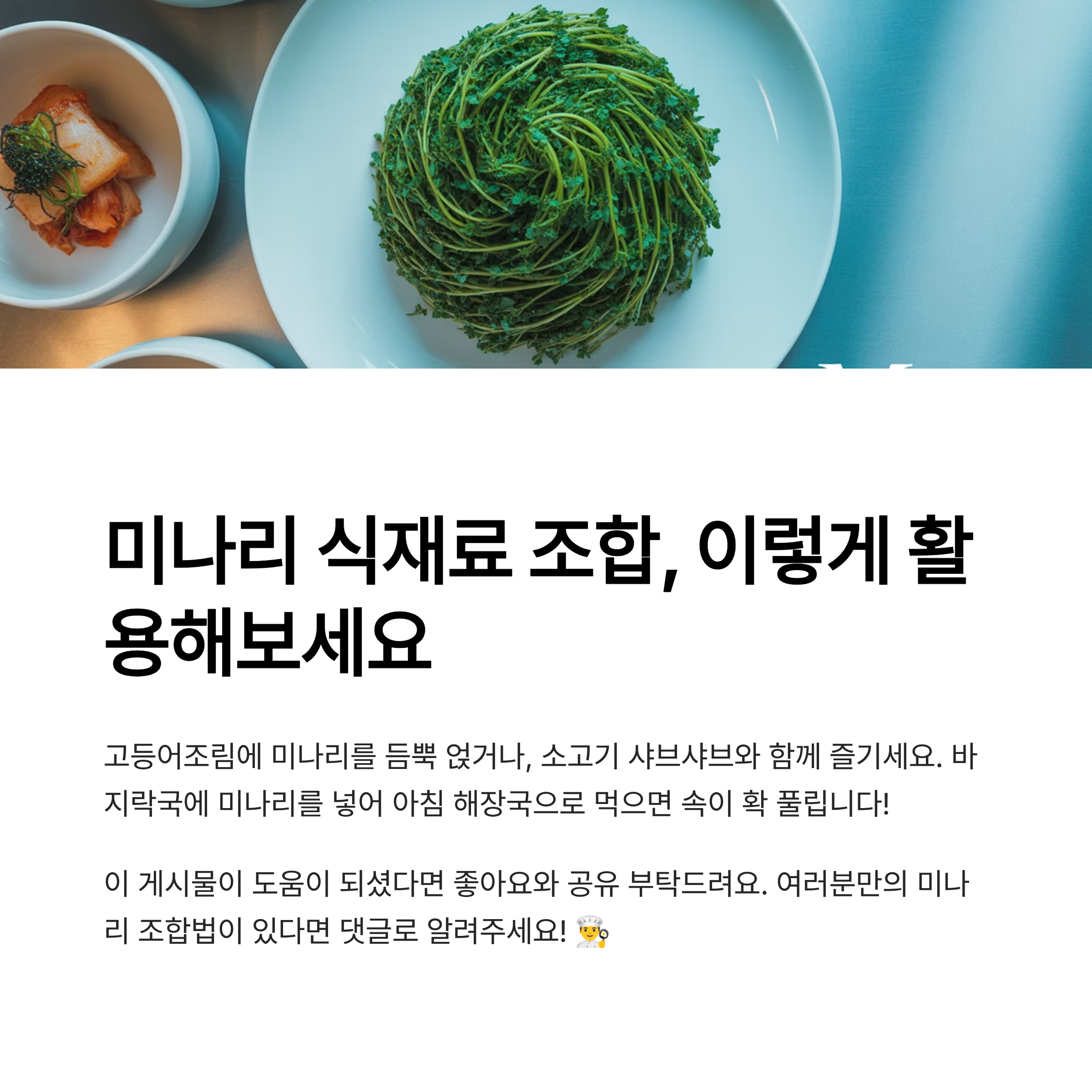 고등어조림에 미나리를 듬뿍 얹어 마무리하거나, 소고기 샤브샤브를 미나리와 함께 즐기면 최고의 식감과 영양을 동시에 얻을 수 있습니다. 또한 바지락국에 미나리를 넣어 아침 해장국으로 먹으면 속이 확 풀리는 경험을 할 수 있습니다.