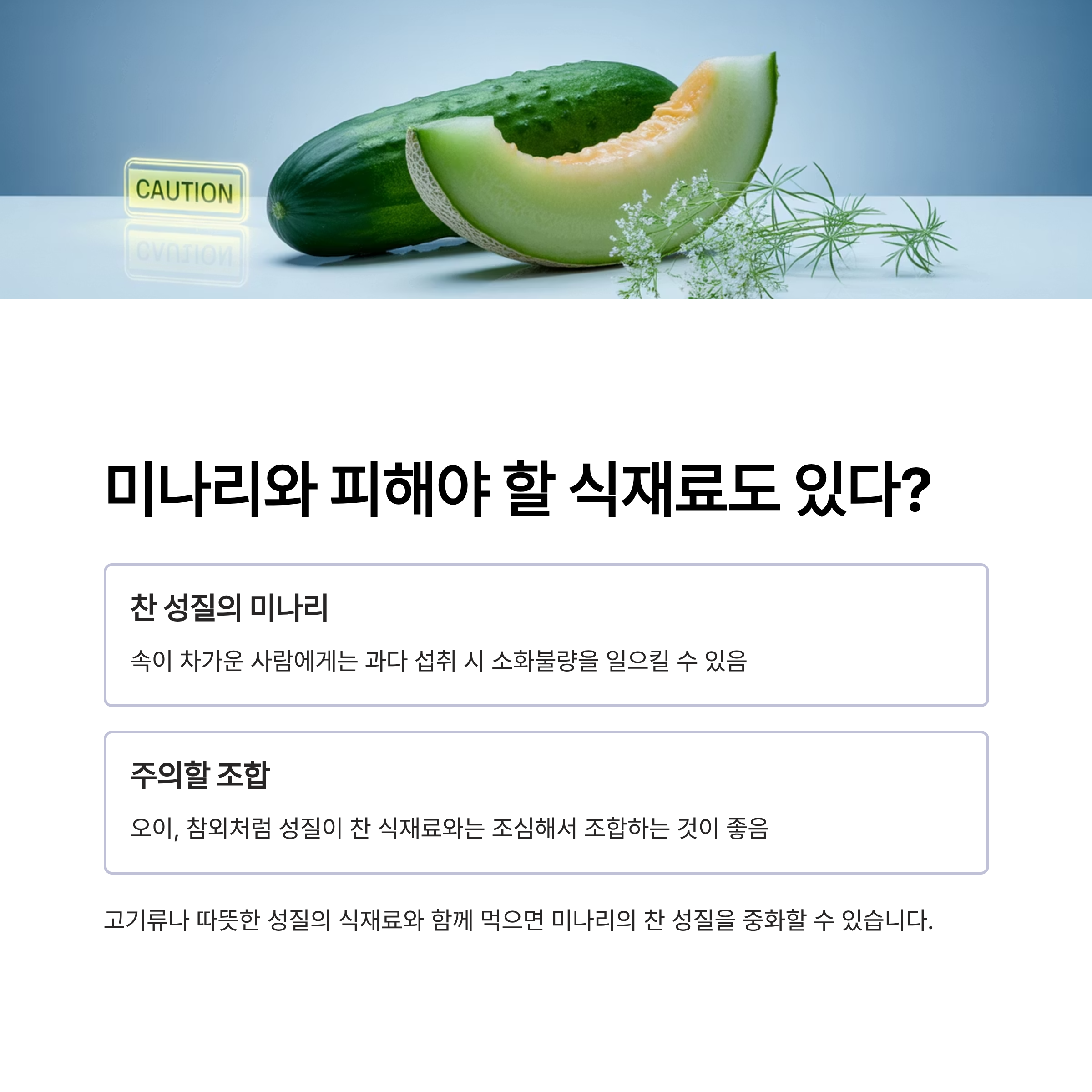 미나리는 찬 성질을 가지고 있어 속이 차가운 사람에게는 과다 섭취 시 소화불량을 일으킬 수 있습니다. 따라서 오이, 참외처럼 성질이 찬 식재료와는 조심해서 조합하는 것이 좋습니다. 대신 고기류나 따뜻한 성질의 식재료와 함께 먹으면 미나리의 찬 성질을 중화할 수 있습니다.