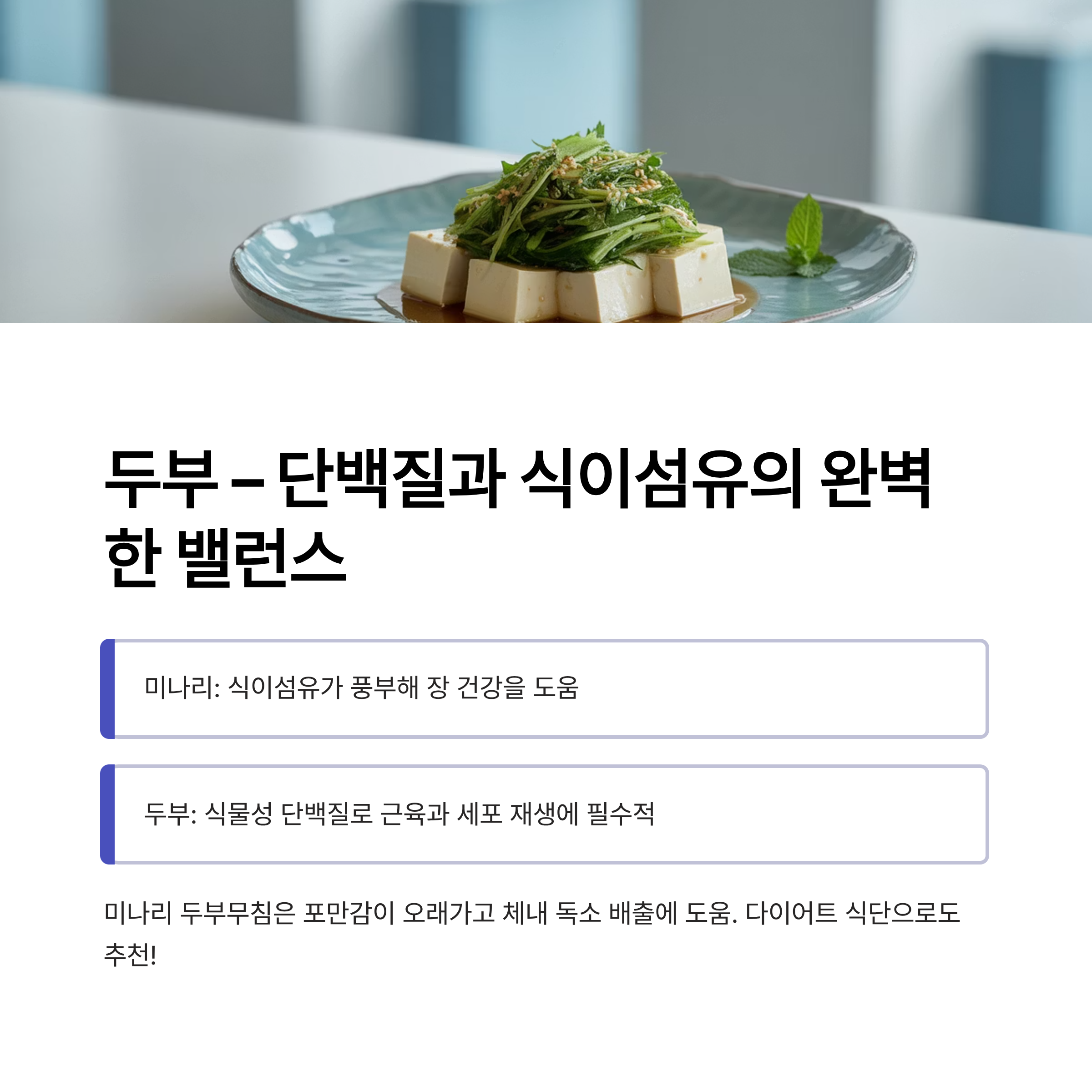 미나리의 식이섬유는 장 건강을 돕고 두부의 식물성 단백질은 근육과 세포 재생에 필수적입니다. 미나리 두부무침을 만들어 먹으면 포만감도 오래가고, 체내 독소를 배출하는 데 큰 도움이 됩니다. 특히 다이어트 식단으로도 추천되는 건강 조합입니다.