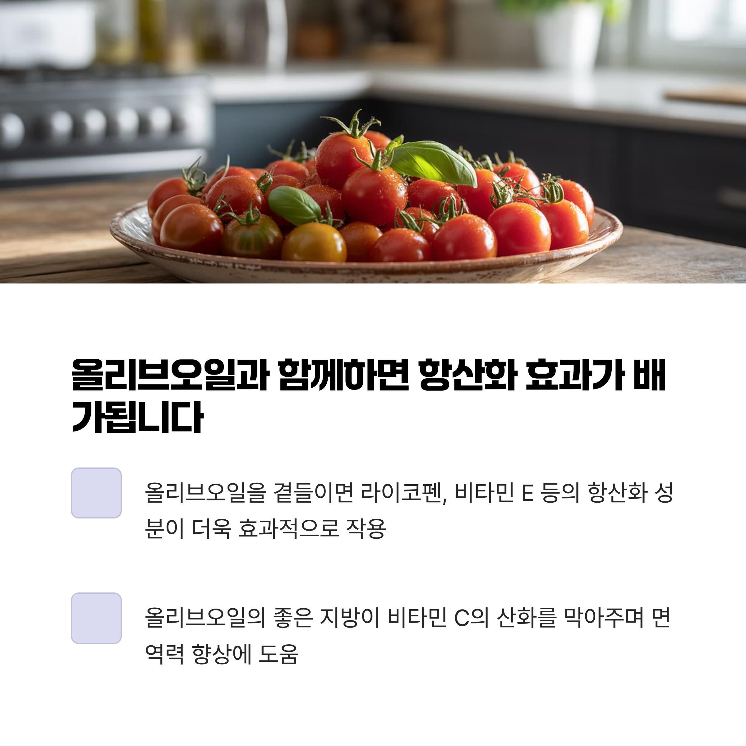 올리브오일의 좋은 지방이 비타민 C의 산화를 막아주며, 면역력을 높이는 데도 도움이 됩니다.