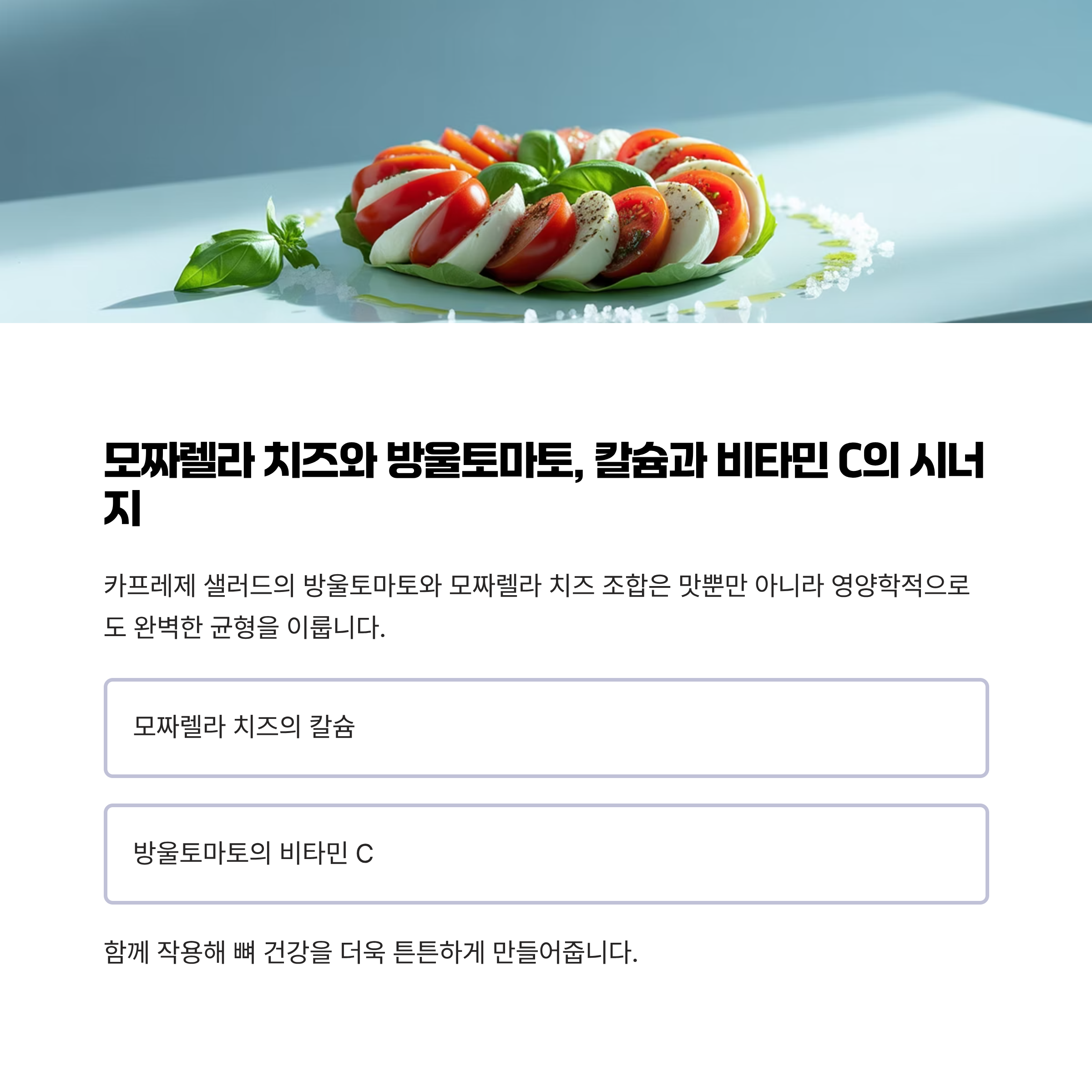 | 모짜렐라 치즈 | 칼슘과 비타민 C의 흡수 시너지로 뼈 건강 강화 |