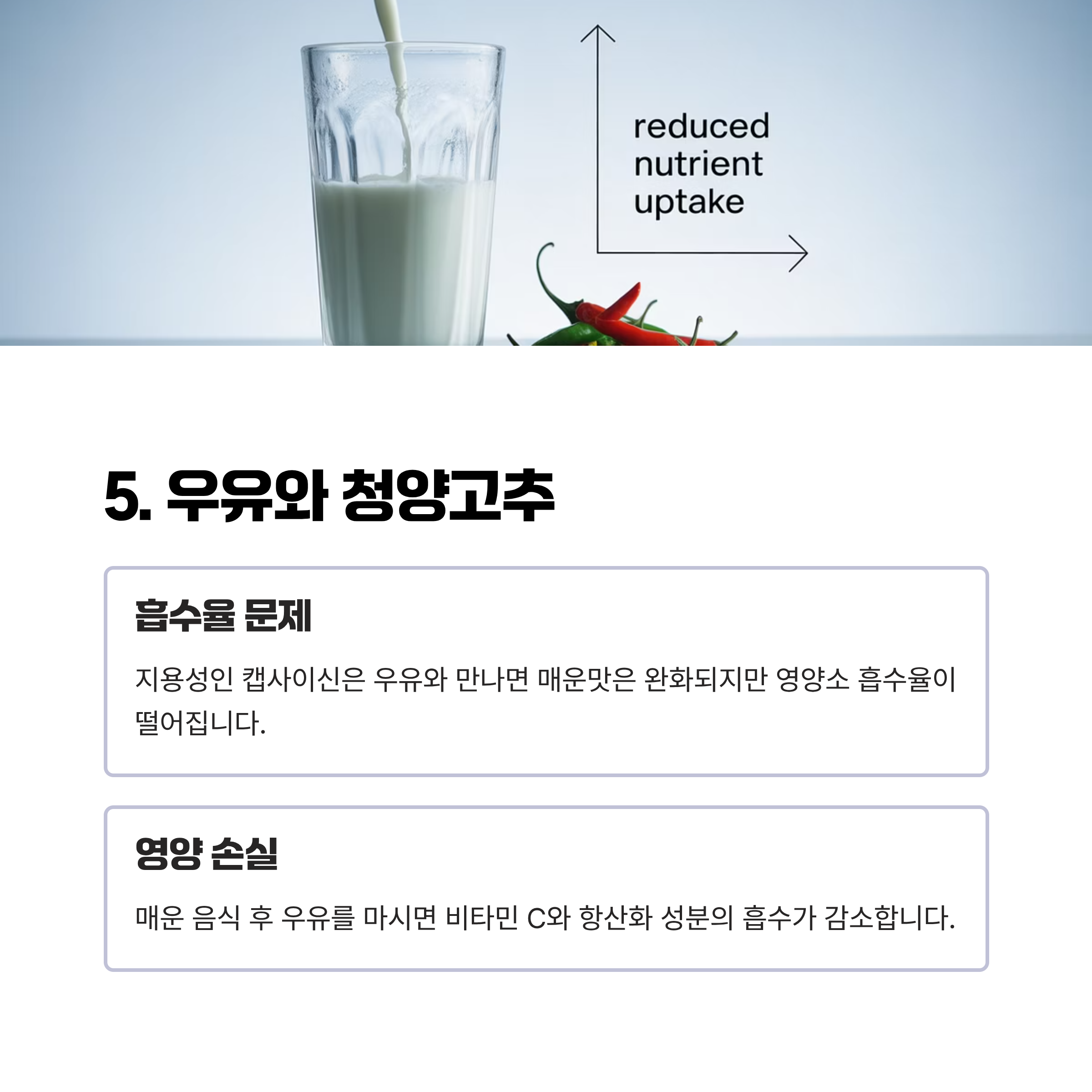| 우유/유제품 | 매운맛 완화는 되나 영양소 흡수 방해 | 매운 음식 후 우유 마시기 |