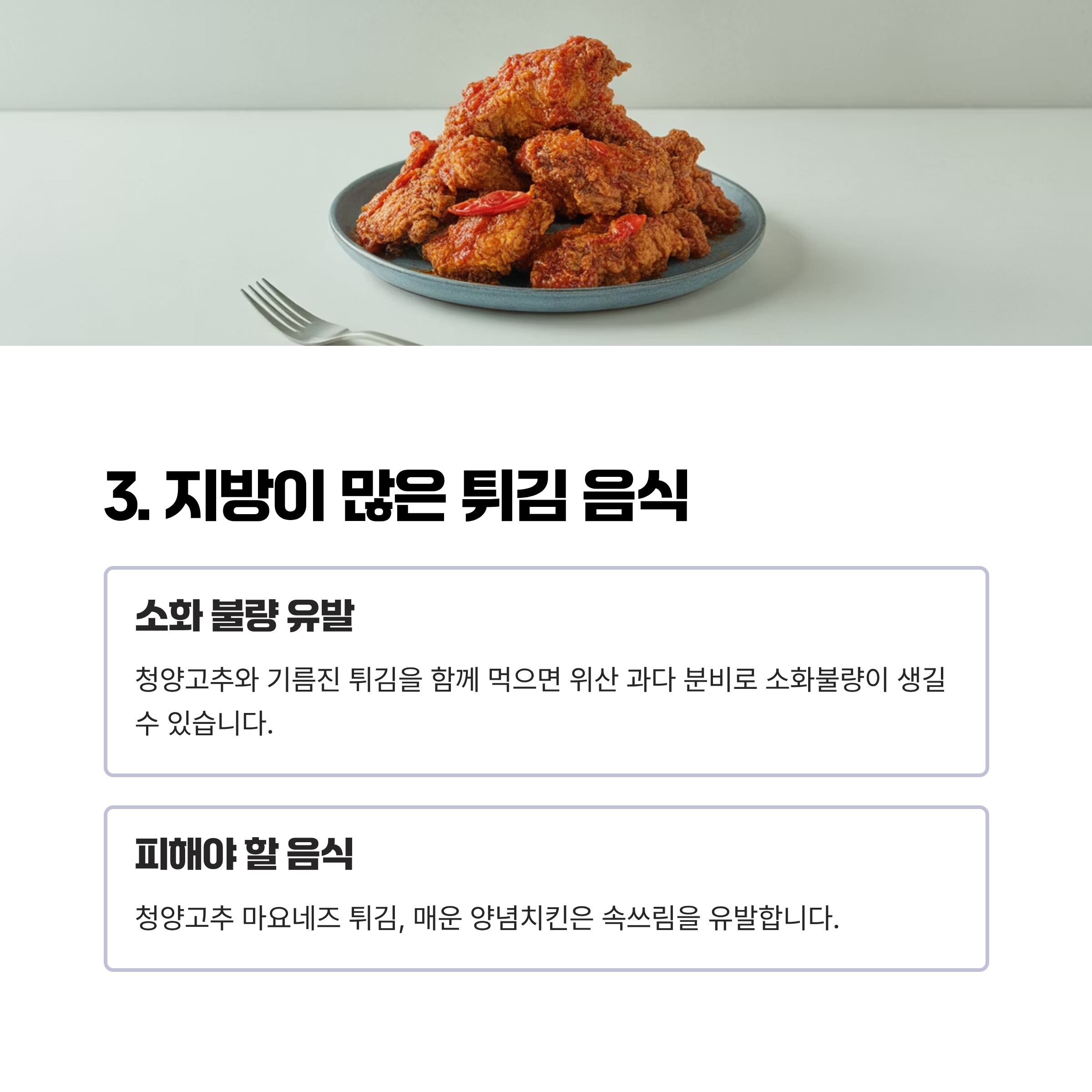 | 튀김 음식 | 소화 불량, 위산 과다 | 청양고추 튀김, 양념치킨 |