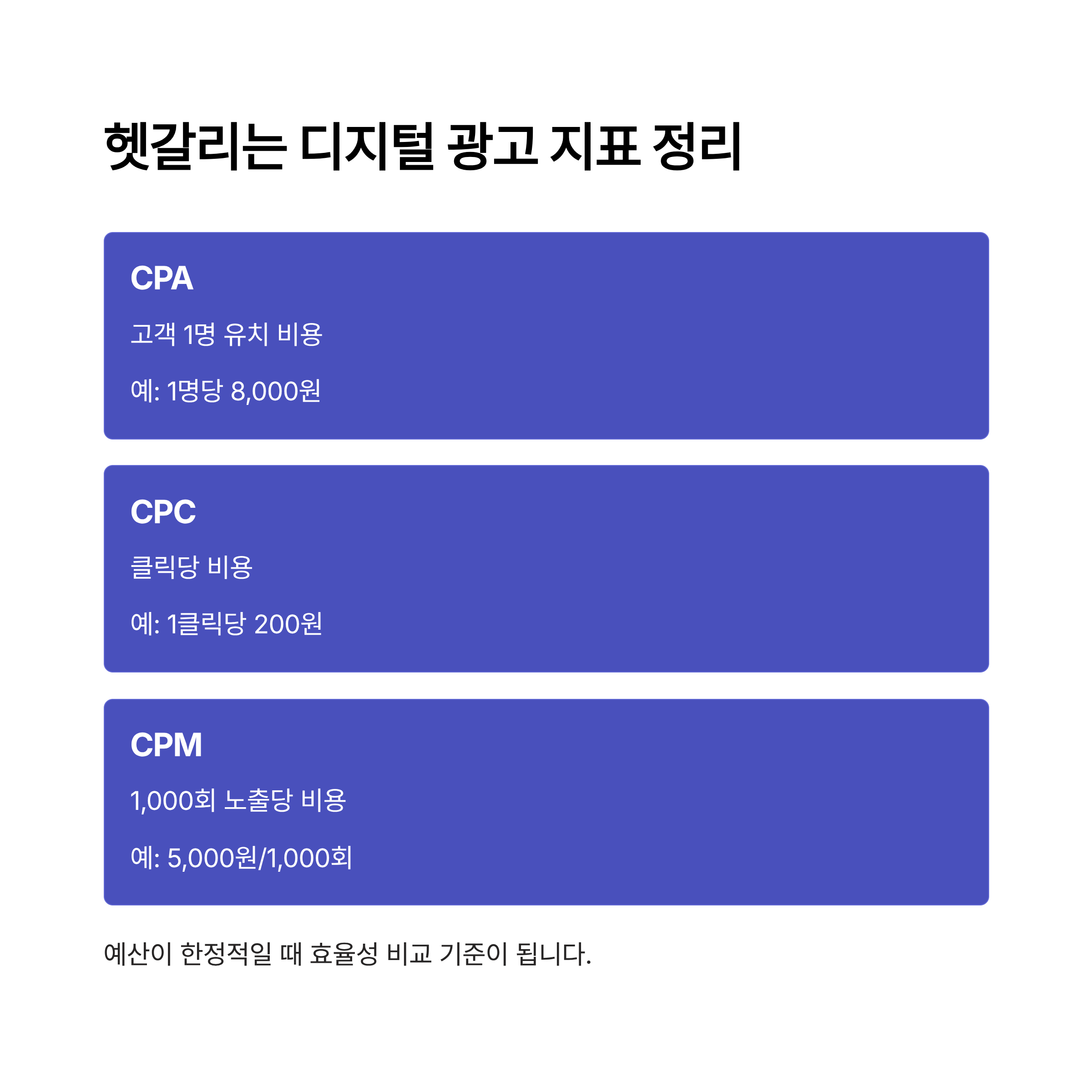 | CPM | 1,000회 노출당 비용 | 1,000회 노출에 5,000원 |